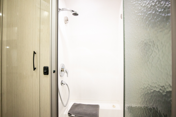 The 25 International Serenity is premium in both size and features. A queen-sized bed, built-in microwave, dark leather upholstery, and electric-powered awning makes for an incredibly comfortable living space. It also has a double bike rack installed on the rear of the trailer.