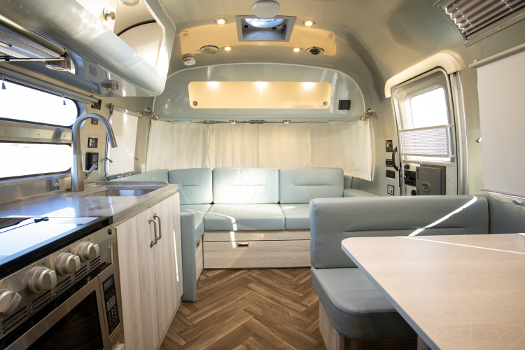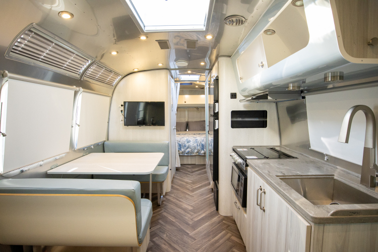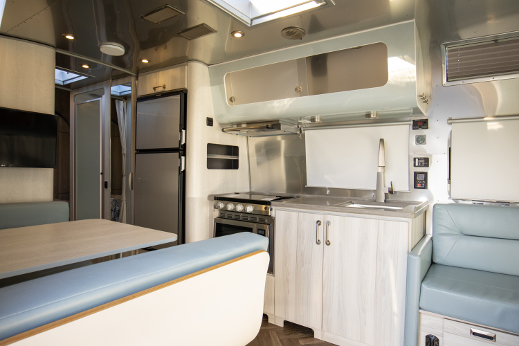 The 28′ International is our largest and most luxurious trailer. A queen-sized bed, lounge couch, separate dinette, light wood interior, dark leather upholstery, microwave convection oven, and electric-powered awning makes this one of the most premium travel trailers ever built.