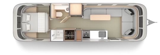 The 30′ Globetrotter is our newest and largest trailer. A queen-sized bed, full-size bed, lounge couch, long dinette, light wood interior, light grey upholstery, microwave convection oven, and electric-powered awning makes this one of the most premium travel trailers ever built.